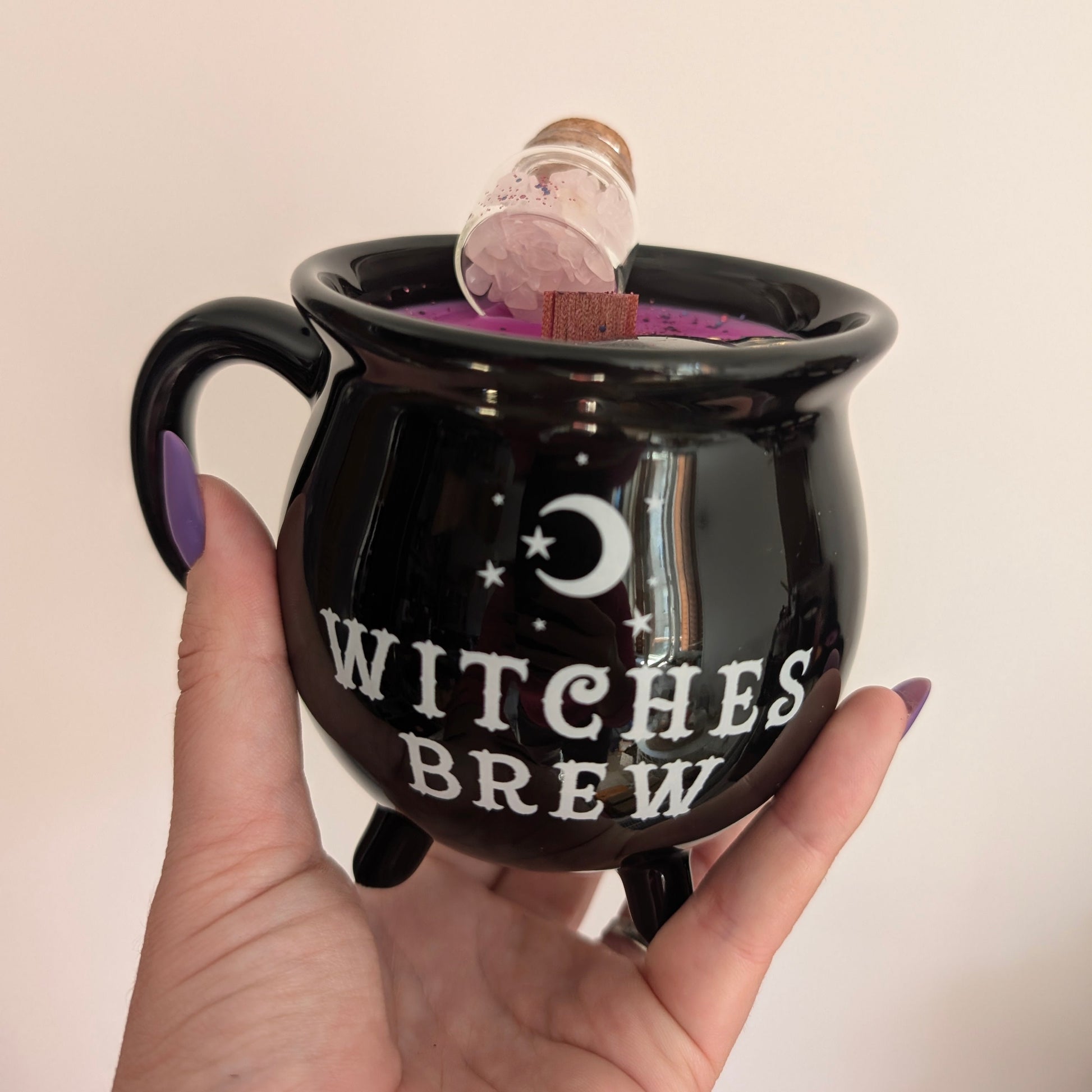 Plongez dans un univers féérique avec la bougie Elixir Enchanté, présentée dans un mug en céramique réutilisable orné de l'inscription "Witches Brew", littéralement "Breuvage de sorcière". Une fois la bougie consumée, ce mug deviendra votre allié pour savourer tes potions préférées : thé, infusion, ou chocolat chaud réconfortant.