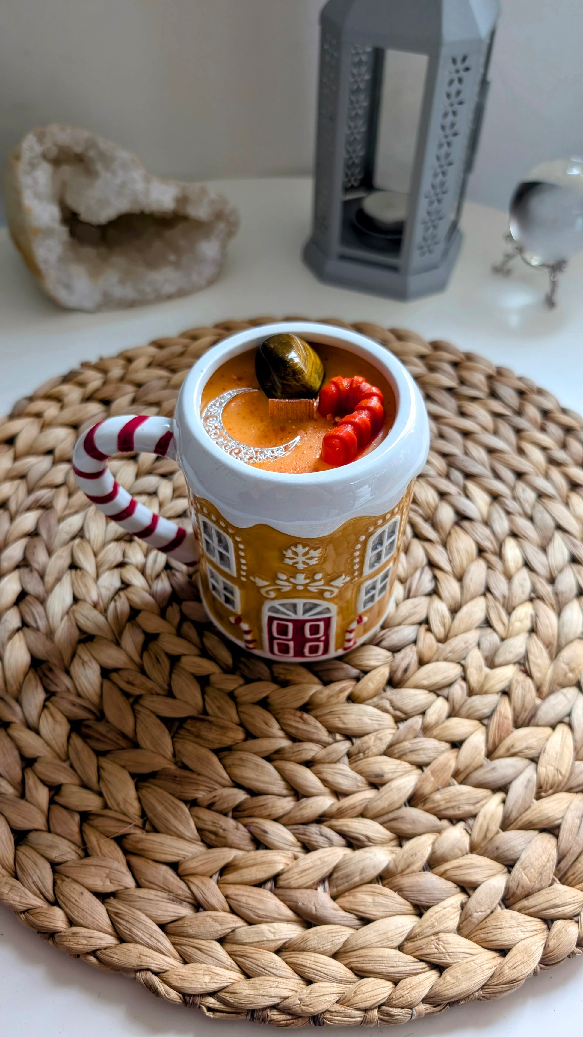 La bougie est composée d'une pierre d'oeil de tigre, ainsi que d'une breloque en métal. Pierre d'ancrage et de protection, l'oeil de tigre aide à repousser les énergies négatives et à avancer avec courage et détermination.